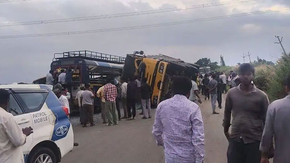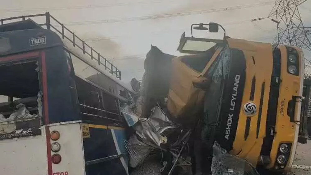 ವಿಕಾರಾಬಾದ್-ಹೈದರಾಬಾದ್ ಮಾರ್ಗದಲ್ಲಿ ಇಂದು ಬೆಳಿಗ್ಗೆ 7.30ರ ಸುಮಾರಿಗೆ ದ್ವಿಚಕ್ರ ವಾಹನವನ್ನು ಹಿಂದಿಕ್ಕುವ ಪ್ರಯತ್ನದಲ್ಲಿ ಟಿಪ್ಪರ್ ಲಾರಿ ಅತಿವೇಗವಾಗಿ ಮುನ್ನುಗಿ ಬಸ್ಗೆ ಡಿಕ್ಕಿ ಹೊಡೆದ ಪರಿಣಾಮ ಈ ದುರಂತ ಸಂಭವಿಸಿದೆ.