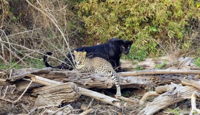 ಪ್ರವಾಸಿಗರೊಬ್ಬರ ಕ್ಯಾಮೆರಾದಲ್ಲಿ ಬ್ಲಾ ್ಯಕ್ ಪ್ಯಾಂಥರ್ ಮತ್ತು ಚಿರತೆ ಸೆರೆಯಾಗಿದ್ದು, ಈ ವಿಡಿಯೋ ಸದ್ಯ ಸಾಮಾಜಿಕ ಜಾಲತಾಣಗಳಲ್ಲಿ ವೈರಲ್ ಆಗಿದೆ.ಕಪ್ಪು ಚಿರತೆಯನ್ನು ನೋಡಿ ಪ್ರವಾಸಿಗರು ಫಿದಾ ಆಗಿದ್ದು, ತಮ್ಮ ಮೊಬೈಲ್ಗಳಲ್ಲಿ ಸೆರೆಹಿಡಿದು ಸಂತಸ ಪಟ್ಟಿದ್ದಾರೆ. ಕಳೆದ ಎರಡು ದಶಕಗಳಿಂದ ಅರಣ್ಯಾಧಿಕಾರಿಗಳು, ವಾಚರ್ಗಳು ಮತ್ತು ಗಾರ್ಡ್ಗಳಿಗೂ ಕಾಣಿಸಿಕೊಳ್ಳದ ಈ ಕಪ್ಪು ಚಿರತೆ, ಕಳೆದೊಂದು ವಾರದಲ್ಲಿ ಹಲವು ಬಾರಿ ಪ್ರತ್ಯಕ್ಷವಾಗಿದೆಯಂತೆ.
