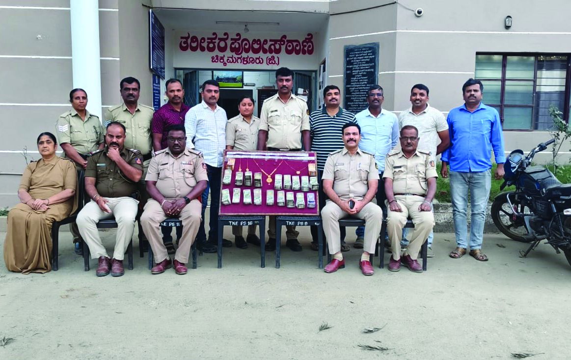 Chikkamagaluru,ಡಿ.22- ಮನೆಗಳ್ಳನ ಮಾಡಿದ ಆರೋಪಿಗಳನ್ನು ತರೀಕೆರೆ ಠಾಣೆ ಪೊಲೀಸರು 24 ಘಂಟೆಯೊಳಗೆ ಬಂಧಿಸಿ 8.76 ಲಕ್ಷ ರೂ. ಮೌಲ್ಯದ ಚಿನ್ನಾಭರಣ ಹಾಗೂ 8.90 ಹಣವನ್ನು ವಶಪಡಿಸಿಕೊಳ್ಳುವಲ್ಲಿ ಯಶಸ್ವಿಯಾಗಿದ್ದಾರೆ.