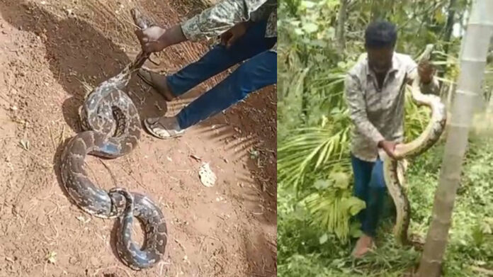 ಹೆಜ್ಜಾಜಿ ಗ್ರಾಮದ ಯೋಗಿ ಎಂಬುವವರು ಕಾರ್ಮಿಕರೊಂದಿಗೆ ಅಡಿಕೆ ಕೀಳಲು ತೆರಳಿದ ಸಂದರ್ಭದಲ್ಲಿ ಭಾರೀ ಗಾತ್ರದ ಹೆಬ್ಬಾವು ಕಂಡುಬಂದಿದೆ. ತಕ್ಷಣ ಉರಗ ರಕ್ಷಕ ನಾಗರಾಜ್ ಅವರಿಗೆ ಕರೆ ಮಾಡಿದರೂ, ಅವರು ಕೆಲಸದ ಒತ್ತಡದಲ್ಲಿದ್ದ ಕಾರಣ ತಮ ಮಿತ್ರ ಹಾಗೂ ಮತ್ತೊಬ್ಬ ಉರಗ ರಕ್ಷಕ ರಾಮಾಂಜಿನಪ್ಪ ಅವರಿಗೆ ಮಾಹಿತಿ ನೀಡಿದ್ದಾರೆ. ಅವರು ಸ್ಥಳಕ್ಕೆ ಧಾವಿಸಿ ಸುರಕ್ಷಿತವಾಗಿ ಹೆಬ್ಬಾವನ್ನು ಹಿಡಿದು ರಕ್ಷಣೆ ಮಾಡಿದ್ದಾರೆ.