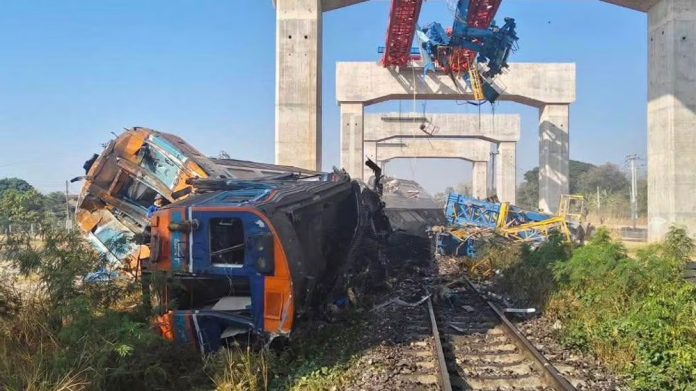 ಎಲಿವೇಟೆಡ್ ಹೈ-ಸ್ಪೀಡ್ ರೈಲು ನಿರ್ಮಿಸಲು ಬಳಸಲಾಗುತ್ತಿದ್ದ ಕ್ರೇನ್, ಬ್ಯಾಂಕಾಕ್ನಿಂದ ಉಬೊನ್ ರಾಟ್ಚಥಾನಿ ಪ್ರಾಂತ್ಯಕ್ಕೆ ಪ್ರಯಾಣಿಸುತ್ತಿದ್ದ ಚಲಿಸುವ ರೈಲಿನ ಮೇಲೆ ಬಿದ್ದು ರೈಲು ಹಳಿತಪ್ಪಿ ಬೆಂಕಿ ಹೊತ್ತಿಕೊಂಡಿತು ಎಂದು ಸಾರ್ವಜನಿಕ ಸಂಪರ್ಕ ಇಲಾಖೆ ತಿಳಿಸಿದೆ.