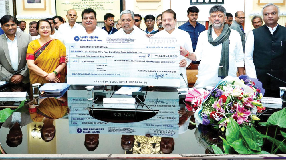 ಬೆಂಗಳೂರು, ಅ.24- ಸಾರ್ವಜನಿಕ ವಲಯದ ಕರ್ನಾಟಕ ಸಾಬೂನು ಮತ್ತು ಮಾರ್ಜಕ ನಿಯಮಿತವು (ಕೆಎಸ್ಡಿಎಲ್) 2024-25ನೇ ಸಾಲಿನ ಲಾಭದಲ್ಲಿ 135 ಕೋಟಿ ರೂಪಾಯಿಗಳನ್ನು ಇಂದು ಸರ್ಕಾರಕ್ಕೆ ಹಸ್ತಾಂತರಿಸಲಾಯಿತು.