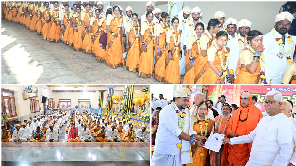 ನಂಜನಗೂಡು,ಜ.17- ಸುತ್ತೂರು ಜಾತ್ರಾ ಮಹೋತ್ಸವದ ಅಂಗವಾಗಿ ನಡೆದ ಸಾಮೂಹಿಕ ವಿವಾಹ ಮಹೋತ್ಸವದಲ್ಲಿ ಪರಮ ಪೂಜ್ಯರು, ಬಂದು-ಬಾಂಧವರು, ಗಣ್ಯರ ಸಮುಖದಲ್ಲಿ ಒಟ್ಟು 135 ಜೋಡಿಗಳು ತಮ ಹೊಸ ಜೀವನಕ್ಕೆ ಕಾಲಿರಿಸಿದ್ದಾರೆ. ಉಚಿತ ಸಾಮೂಹಿಕ ವಿವಾಹ ಮಹೋತ್ಸವವನ್ನು ಸುತ್ತೂರ ಶ್ರೀಗಳ ಆಶೀರ್ವಾದದಿಂದ 2009 ರಿಂದಲೂ ವಿಜೃಂಭಣೆ ನಡೆಸಿಕೊಂಡು ಬರುತ್ತಿದ್ದು ಇದುವರೆಗೆ 3,886 ಜೋಡಿ ತಮ ನೂತನ ಜೀವನವನ್ನು ಸುತ್ತೂರಿನ ಉಚಿತ ಸಾಮೂಹಿಕ ವಿವಾಹ ಎಂಬ ದೀಪದಲ್ಲಿ ಬೆಳಗಿಸಿಕೊಂಡಿದ್ದಾರೆ.
