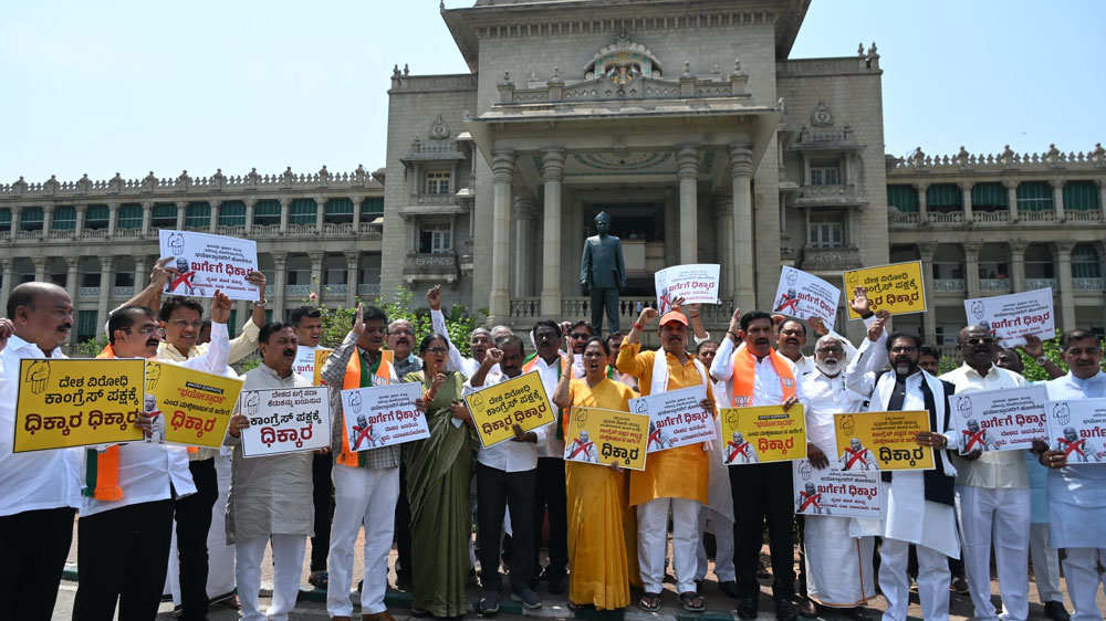 ವಿಧಾನಸೌಧ-ವಿಕಾಸಸೌಧ ಮಧ್ಯಭಾಗದಲ್ಲಿರುವ ರಾಷ್ಟ್ರಪಿತ ಮಹಾತ ಗಾಂಧಿ ಪ್ರತಿಮೆ ಎದುರು ರಾಜ್ಯ ಬಿಜೆಪಿ ಅಧ್ಯಕ್ಷ ಬಿ.ವೈ.ವಿಜಯೇಂದ್ರ, ವಿಧಾನಸಭೆಯ ಪ್ರತಿಪಕ್ಷದ ನಾಯಕ ಆರ್.ಅಶೋಕ್, ಕೇಂದ್ರ ಸಚಿವೆ ಶೋಭಾ ಕರಂದ್ಲಾಜೆ, ಮಾಜಿ ಡಿಸಿಎಂ ಹಾಗೂ ಸಂಸದ ಗೋವಿಂದ ಕಾರಜೋಳ ಸೇರಿದಂತೆ ಶಾಸಕರು, ವಿಧಾನಪರಿಷತ್ ಸದಸ್ಯರು ಸೇರಿದಂತೆ ಮತ್ತಿತರರು ಪ್ರತಿಭಟನೆ ನಡೆಸಿ ಖರ್ಗೆ ವಿರುದ್ಧ ತೀವ್ರ ವಾಗ್ದಾಳಿ ನಡೆಸಿದರು.