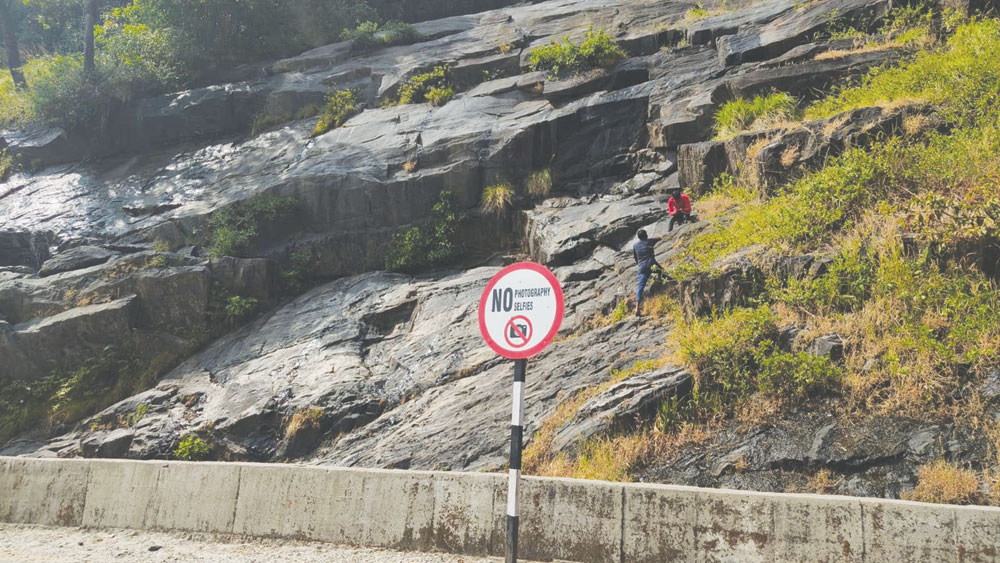 ನೀವು ಹೇಳೋದನ್ನು ಹೇಳುತ್ತಲೇ ಇರಿ, ನಾವು ಮಾಡೋದನ್ನು ಮಾಡುತ್ತಲೇ ಇರುತ್ತೇವೆ ಎಂಬಂತೆ ವರ್ತಿಸುತ್ತಿರುವ ಪ್ರವಾಸಿಗರು, ಎತ್ತರದ ಬಂಡೆಗಳ ಮೇಲೆ ಹತ್ತಿ ಪ್ರಾಣದ ಹಂಗು ತೊರೆದು ಫೋಟೋಶೂಟ್ನಲ್ಲಿ ಮಗ್ನರಾಗಿದ್ದಾರೆ.